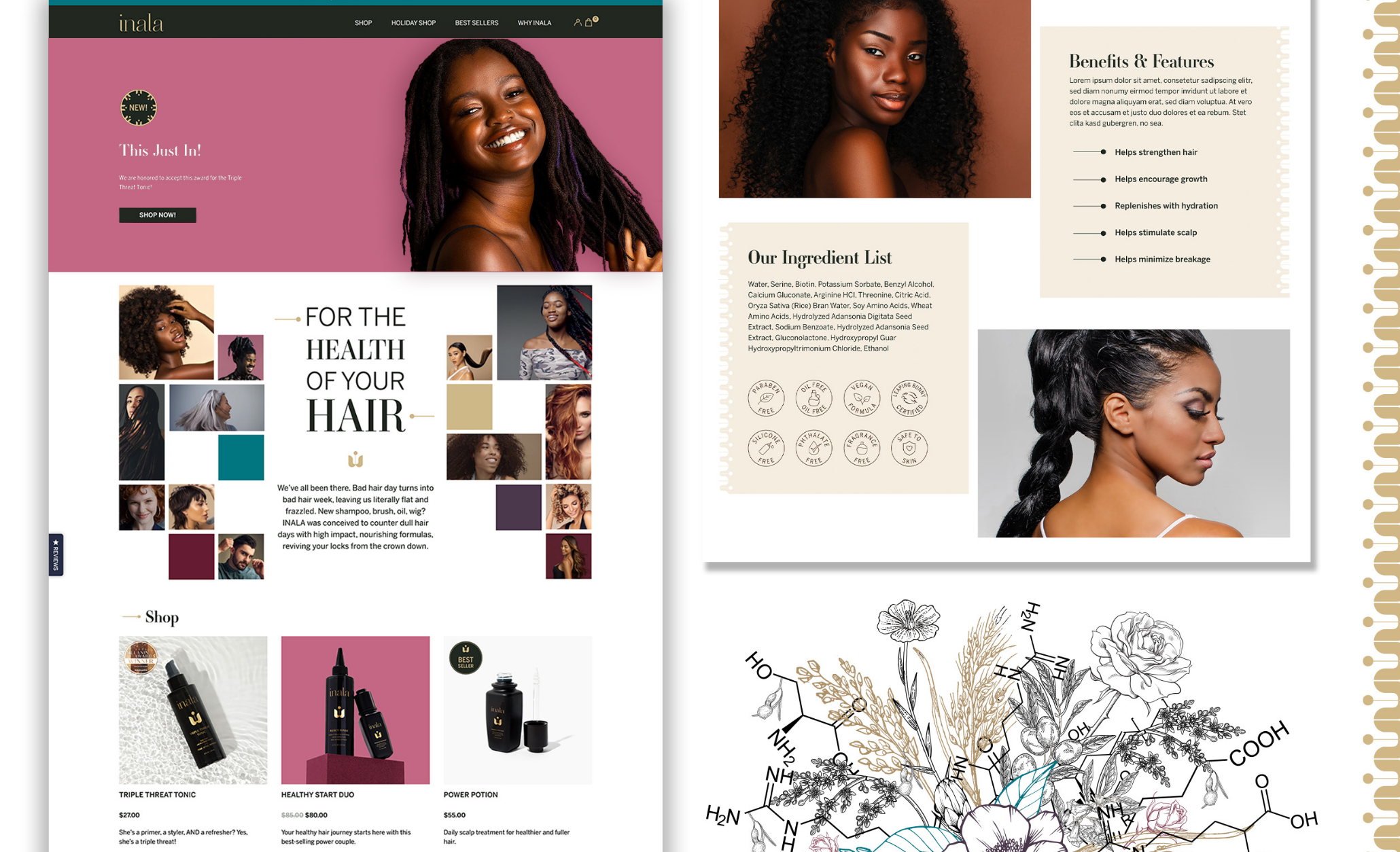 Following our work to identify Inala’s brand and packaging, Skaggs designed Inala’s website to align with its newly established aesthetic goals. The website is instantly welcoming and playful, with clear descriptions and pleasing still and video images of different types of healthy, beautiful hair. Skaggs also designed their Amazon store using the same components.